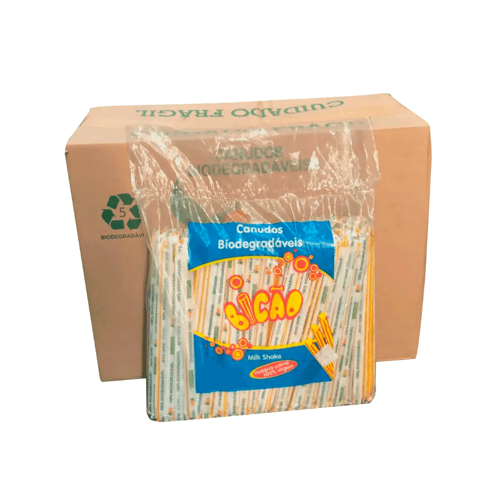 Canudo biodegradável para milkshake, com as cores branca e vermelha, embalado individualmente em sachês pela marca Bicão. Este pacote contém 3.000 unidades. Este tipo de canudo é projetado especialmente para milkshakes e é biodegradável, o que significa que é mais amigável ao meio ambiente do que os canudos tradicionais de plástico. As cores branca e vermelha podem adicionar um toque estético ao serviço de bebidas. Por favor, note que as dimensões específicas do produto não foram fornecidas.