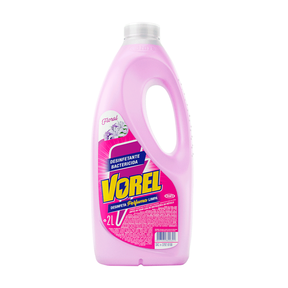 Benefícios: Possui satisfatória ação bactericida frente às cepas de Staphylococcus aureus, Salmonella choleraesuis; Sua formulação deixa um agradável perfume que permanece após a aplicação do produto; Produto biodegradável. Modo de Usar: Para desinfecção de vasos sanitários, ralos e latas de lixo: Aplique VOREL puro diretamente sobre as superfícies, deixando agir por 10 minutos. Para limpeza de pisos, pias, azulejos e superfícies laváveis: Use aproximadamente 50 ml de VOREL para cada litro de água, aplique com pano ou esponja, não é necessário enxaguar.