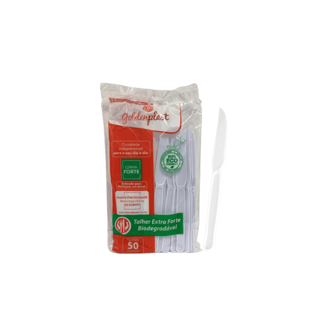 Os produtos Goldenplast Biodegradáveis são símbolo de praticidade e responsabilidade ambiental - Sustentabilidade em Suas Mãos: As Facas Brancas Goldenplast são fabricadas com material biodegradável, o que significa que elas se decompõem naturalmente, contribuindo para a redução do impacto ambiental. Ao escolher essas facas, você demonstra seu compromisso com um planeta mais saudável. - Praticidade para Comércios de Refeições: Essas facas descartáveis economizam tempo e esforço com a limpeza, permitindo que você se concentre no que realmente importa: servir deliciosas refeições aos seus clientes. - Versatilidade para Eventos Especiais: Em festas, casamentos, churrascos ou confraternizações, a apresentação dos utensílios faz toda a diferença. - Resistência Garantida: Apesar de serem biodegradáveis, essas facas não comprometem a resistência. O material em poliestireno reforçado as torna robustas e confiáveis, garantindo que elas cumpram sua função de maneira eficiente. - Dimensões Perfeitas (17,5cm): Com 17,5cm de comprimento, essas facas são ideais para cortar uma variedade de alimentos de forma eficaz, proporcionando uma experiência de uso confortável.