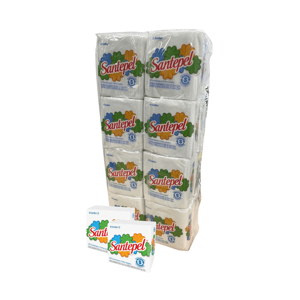 Guardanapo 24X22 folha simples Santepel com 800 folhas. Este produto é produzido com 100% de fibras naturais, utilizando-se fibras virgens e recicladas, e não transgênicas. Possui excelente alvura e maciez, bem como boas propriedades úmidas. Não causa irritações dérmicas. Largura Folha: 220 mm Comprimento Folha: 240 mm Fardo com 16 pacotes de 50 folhas