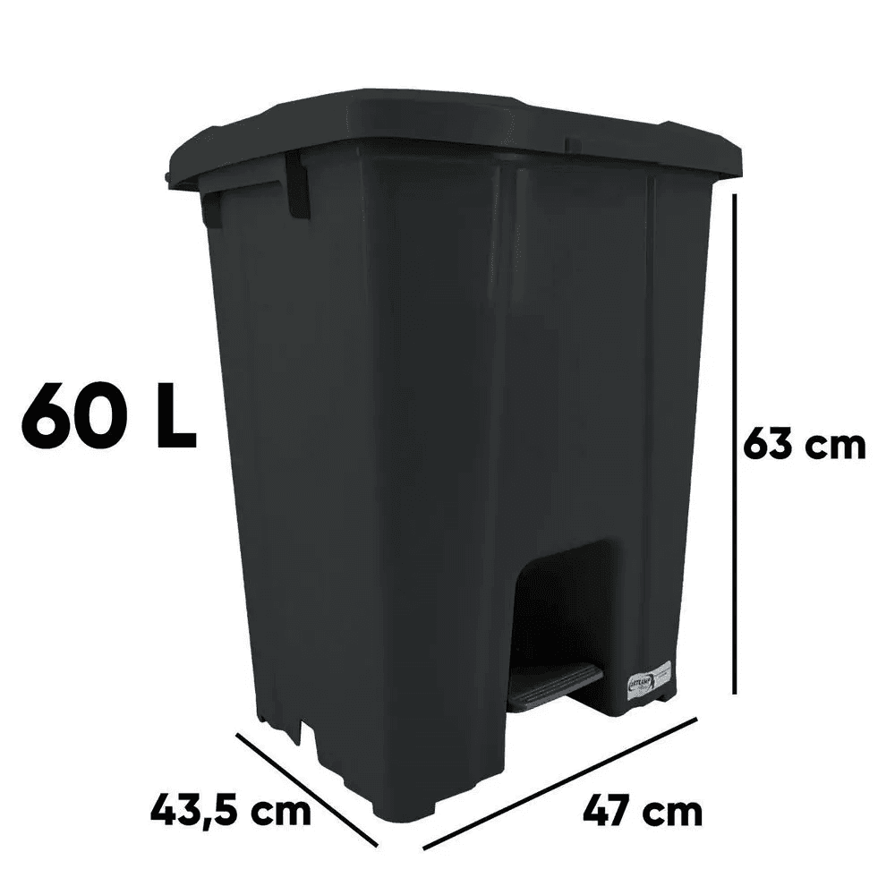 A Lixeira JSN plástica Quadrada com Pedal de 60 Litros na cor Preta é utilizada para descartar dejetos com facilidade, sem contato direto com o recipiente, evitando assim o risco de contaminação. É ideal para atender às necessidades em escritórios, salas comerciais e até mesmo em residências, tanto na cozinha quanto no banheiro. Compacta, ela se encaixa em espaços pequenos e requer discrição para manter o ambiente harmonioso. Muito resistente e prática, com seu plástico reforçado oferece ao usuário alta durabilidade. Seu suporte para fixar o saco de lixo proporciona muita praticidade, garantindo que a lixeira fique esteticamente perfeita e funcional. Fabricada em plástico polipropileno injetado, a tampa é acionada através de um pedal, com capacidade para 60 litros. Acompanha 2 ganchos para fixação do saco de lixo. Peso: 3,520 kg. Capacidade: 60 litros. Medidas: 63 cm (altura) x 47 cm (largura) x 43,5 cm (profundidade).